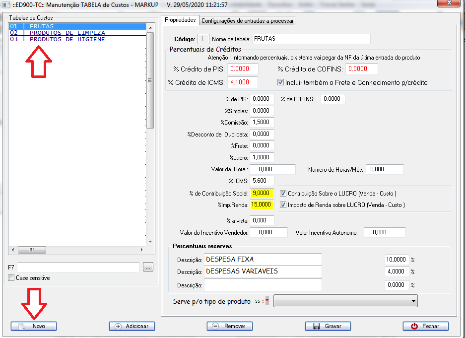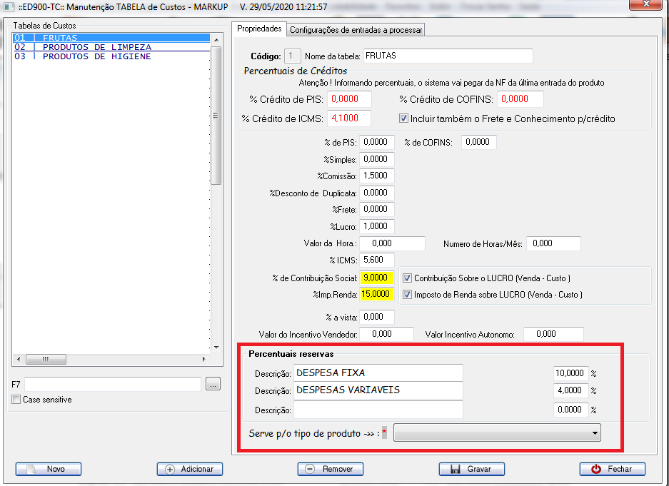 Adicione os percentuais a serem aplicados no valor de custo dessa categoria de produtos. Nos percentuais reservas podem ser adicionados outros custos são descritos acima, como despesas fixas e variáveis. A contabilidade pode auxiliar a fornecer determinados valores.