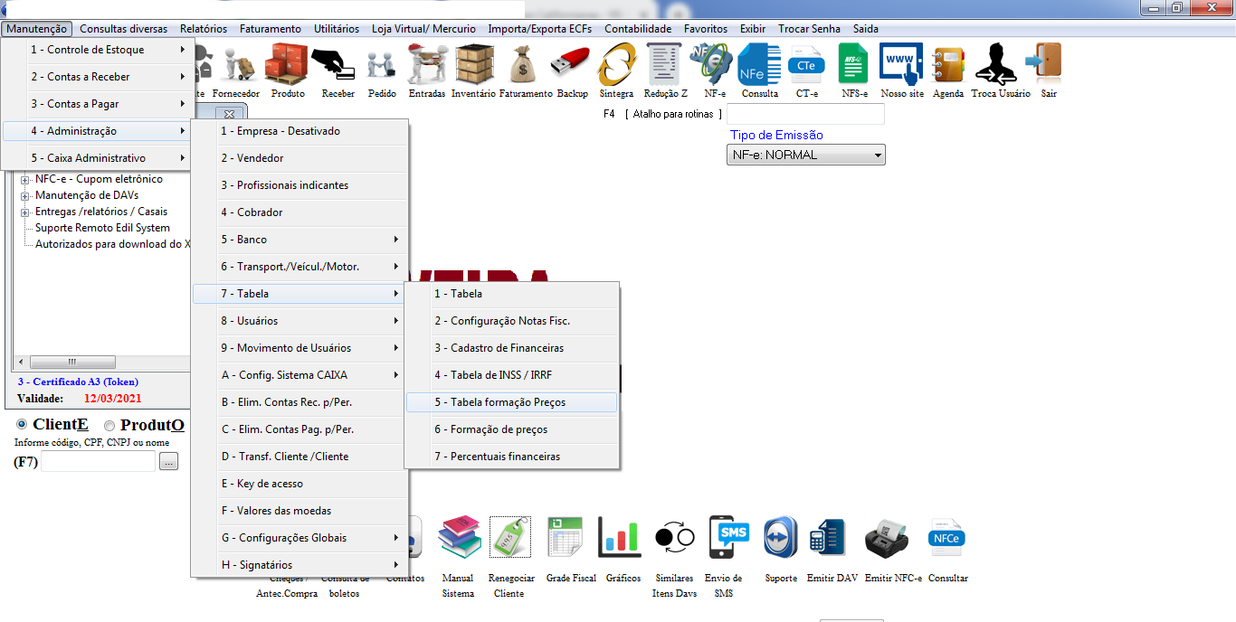 Para configurar uma nova tabela de custo ou alterar uma tabela de custo existente, acesse Manutenção 4-7-5.