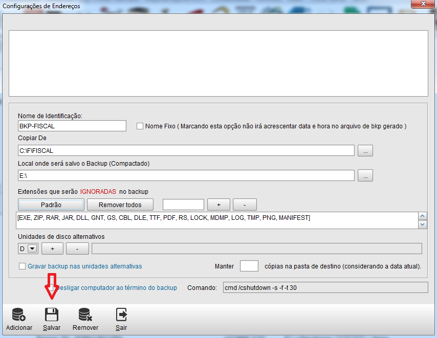 Informe o nome de identificação do Backup, a partir de onde ele será copiado e o local onde o Backup será salvo, se é pen drive ou um HD. Depois, clique em “Salvar”.